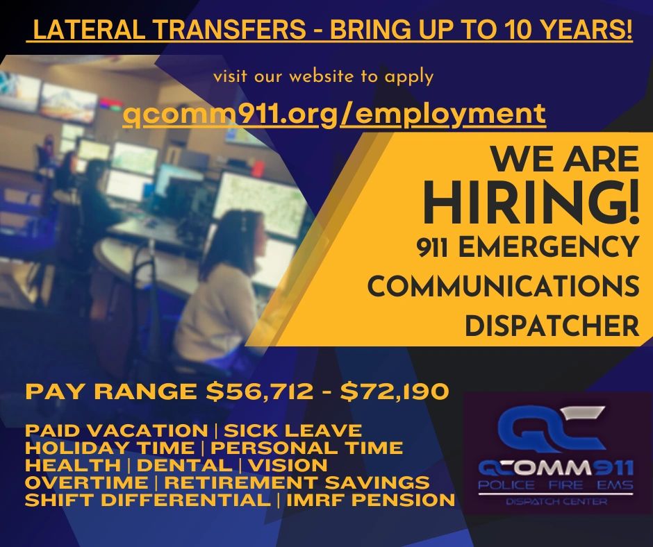 When a dispatcher position becomes available at QCOMM911, all applicants will be notified via email or phone to schedule a testing session. These sessions utilize specialized software which tests multi-tasking ability, keyboarding skills, listening and reasoning skills. Once testing is completed and scored, those meeting required parameters will be interviewed by shift leads and the training coordinator. After a successful interview, applicants are scheduled for physical and psychological exams along with a background check conducted by one of our police agencies. Upon passing those requirements applicants will be offered a position at QCOMM911 and a start date will be discussed.